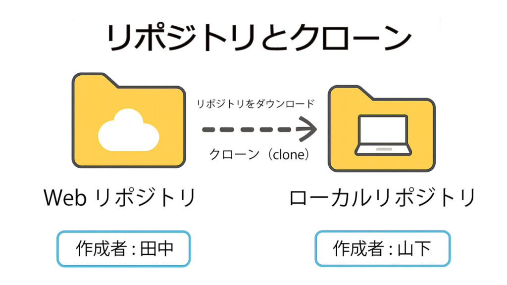 リモート上にある既存のリポジトリをクローンして自分のパソコン環境に「ローカルリポジトリ」として取り込むことで、他の開発者が行った変更を自分の環境で確認したり、自分が加えた変更を他の人と共有したりすることが容易になります。
